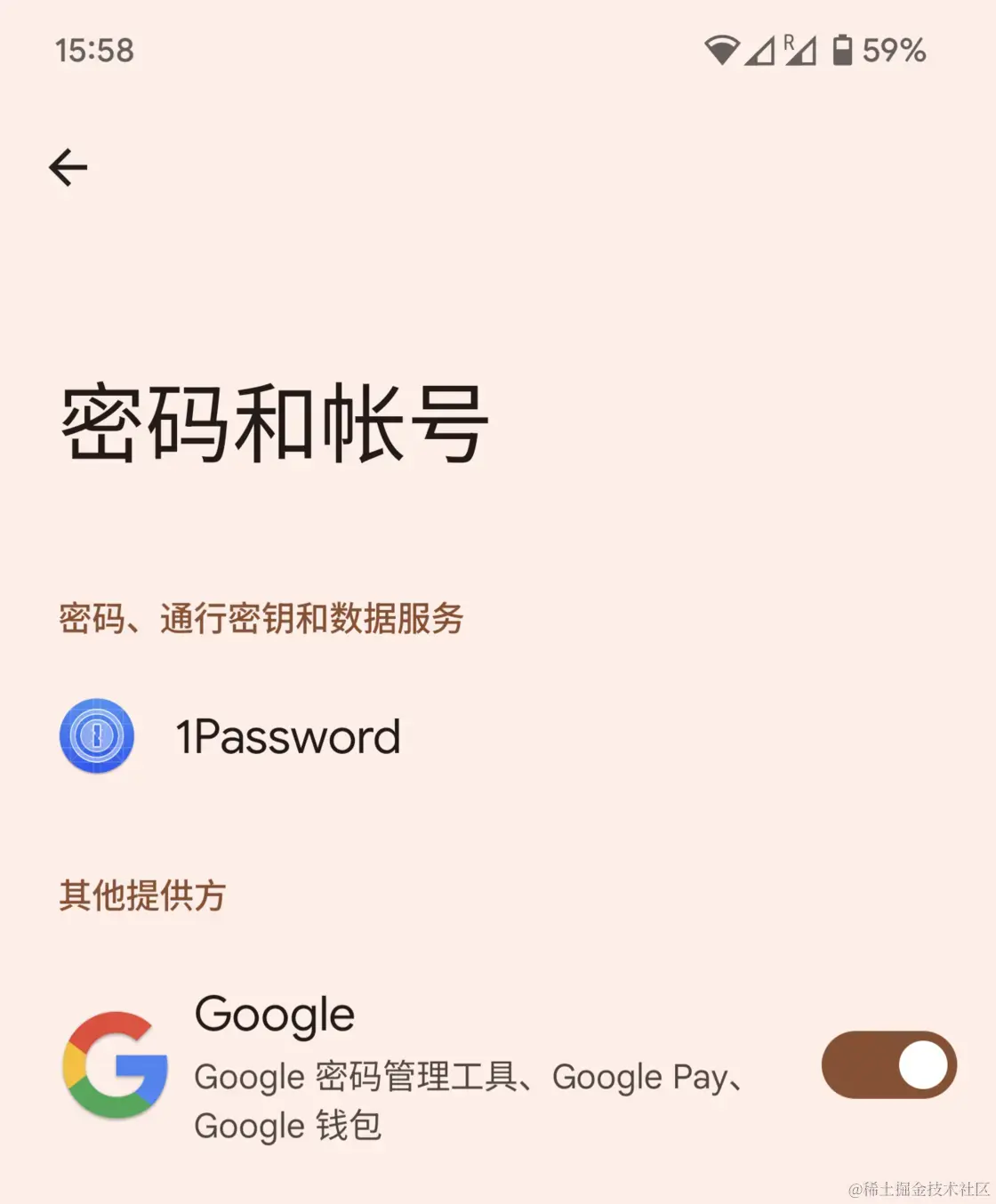 目前我们在 Android 14 的密码和帐号设置中可以看到通行密钥认证服务的相关设置,换句话说除了可以将手机上的生物识别信息作为通行密钥认证方式,Android 14 也支持添加第三方应用作为通行密钥管理应用。