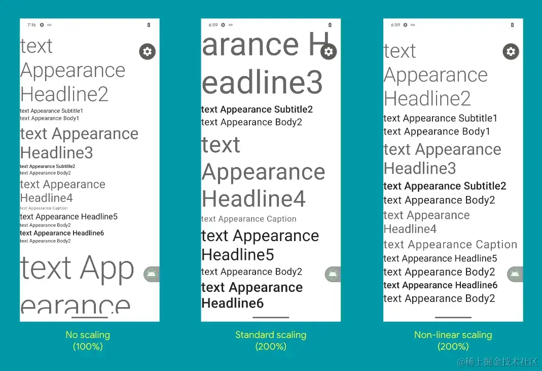 正常大小、线性 200% 缩放与非线性 200% 缩放,非线性缩放能在保证所有文本具备可读性的同时避免原本就已经很大的字体被机械放大