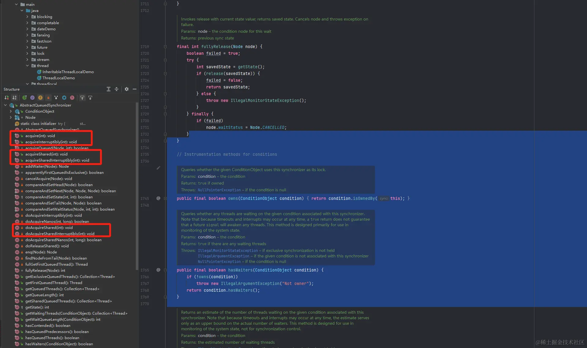 不同的自定义同步器竞争共享资源的方式也不同。自定义同步器在实现时只需要实现共享资源state的获取与释放方式即可,至于具体线程等待队列的维护(如获取资源失败入队/唤醒出队等),AQS已经在顶层实现好了。自定义同步器实现时主要实现以下几种方法: