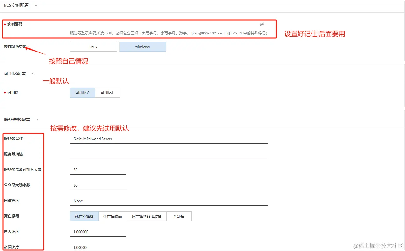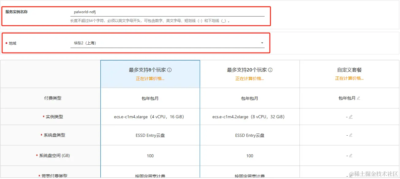 - 选择配置,一般来说配置越高越流畅。这游戏比较吃内存,Pocketpair官方的推荐配置是4核16G(Palworld tech guide)可,带宽方面推荐不限流量的固定带宽,延时低,畅玩体验更佳。