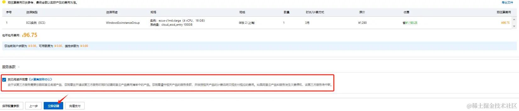 - 在服务确认页面,勾选同意服务条款,点击“立即创建”,后面就是付款流程。