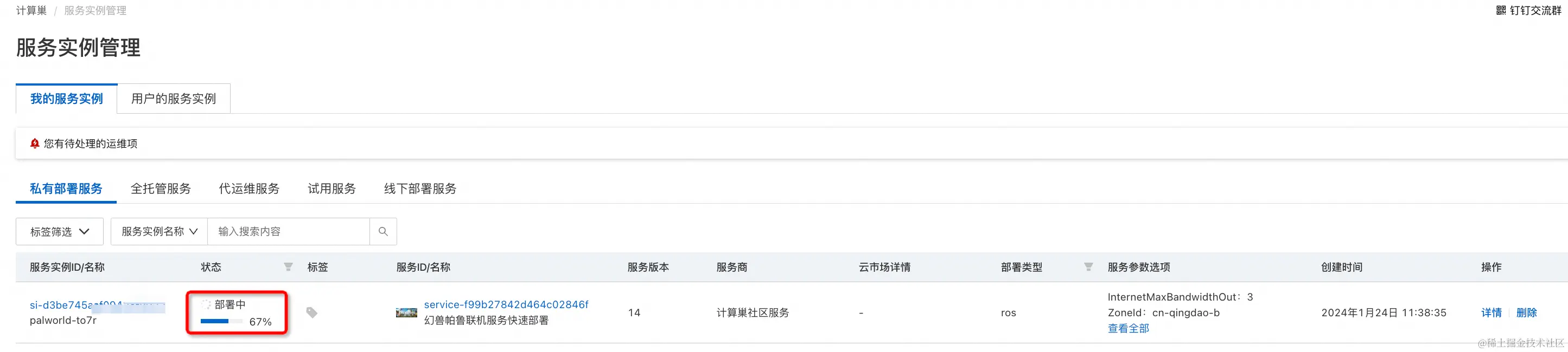 - 当出现提交成功提示,说明服务已经开始创建,点击“去列表查看”,可以看到服务正在部署中。