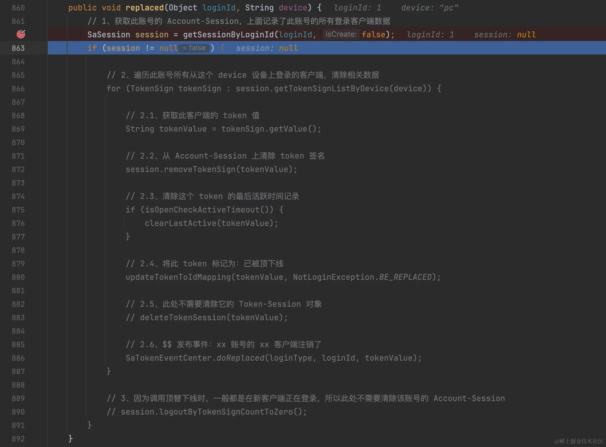 因为这次是同端登录,可以看到session的tokenSign变为最新的,token虽然还有两条,但其中一条指向的不再是账号id,而是-4,表示被顶下线,按理讲这里的token-session应该是要被清除了的,源码里这里个步骤被注释了,不太理解。保留疑问。