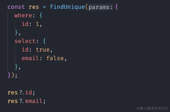 在上面的例子中,queryUserRes 的类型完全由 findUnique 方法中的 select 属性来决定——你 select 哪些属性,哪些属性就会出现在结果中,是不是很神奇?