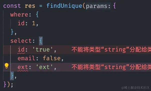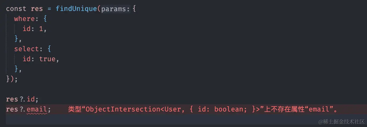 FindUniqueParams<SelectFields> 可能不太好理解,来看实际的例子: