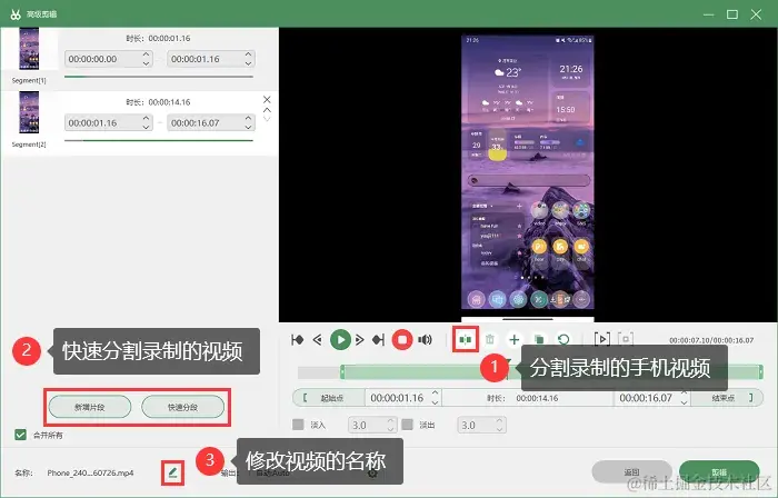 第4步:点击 “录制” 按钮,录制手机页面,录制结束后,我们可以保存到指定位置,也可以进入 “高级剪辑” 页面对视频进行处理。