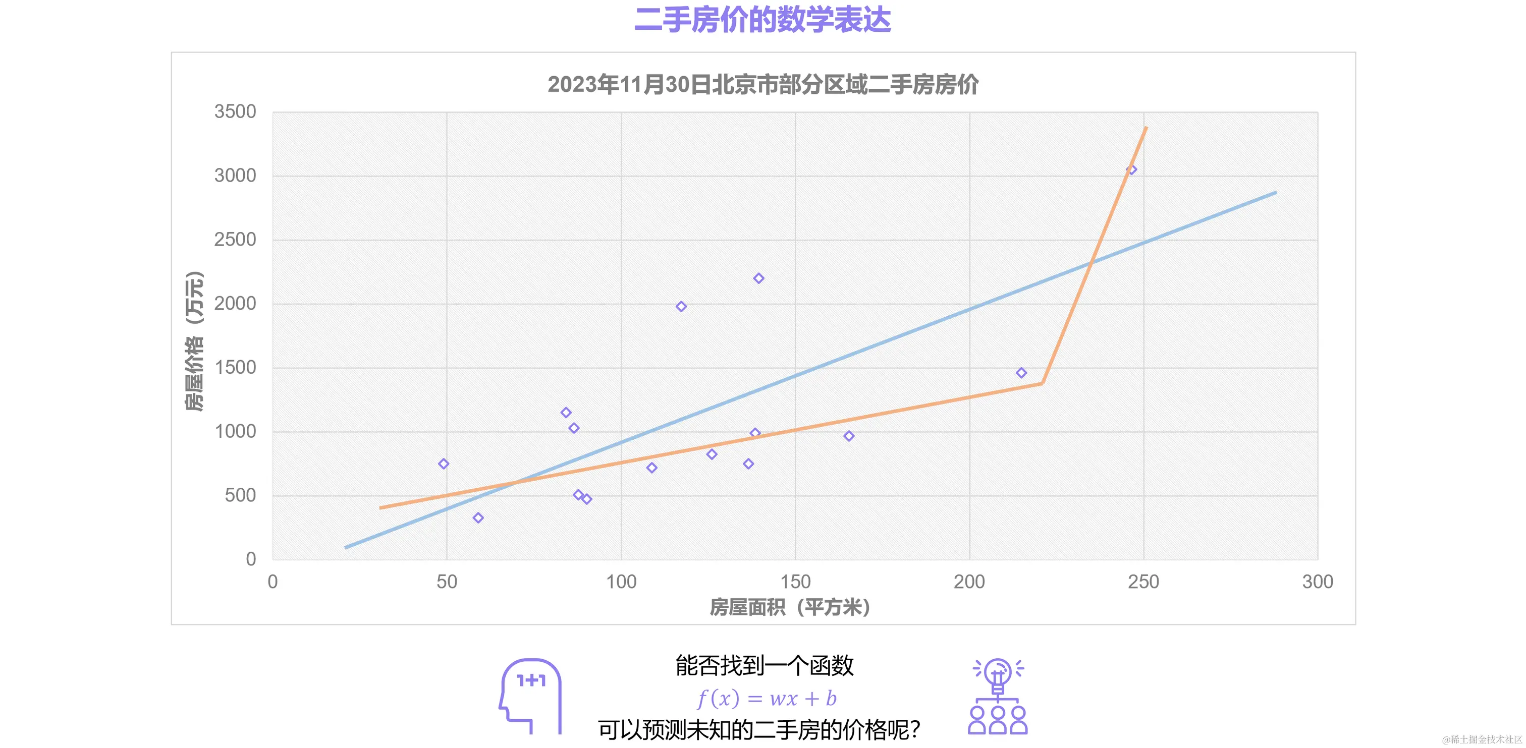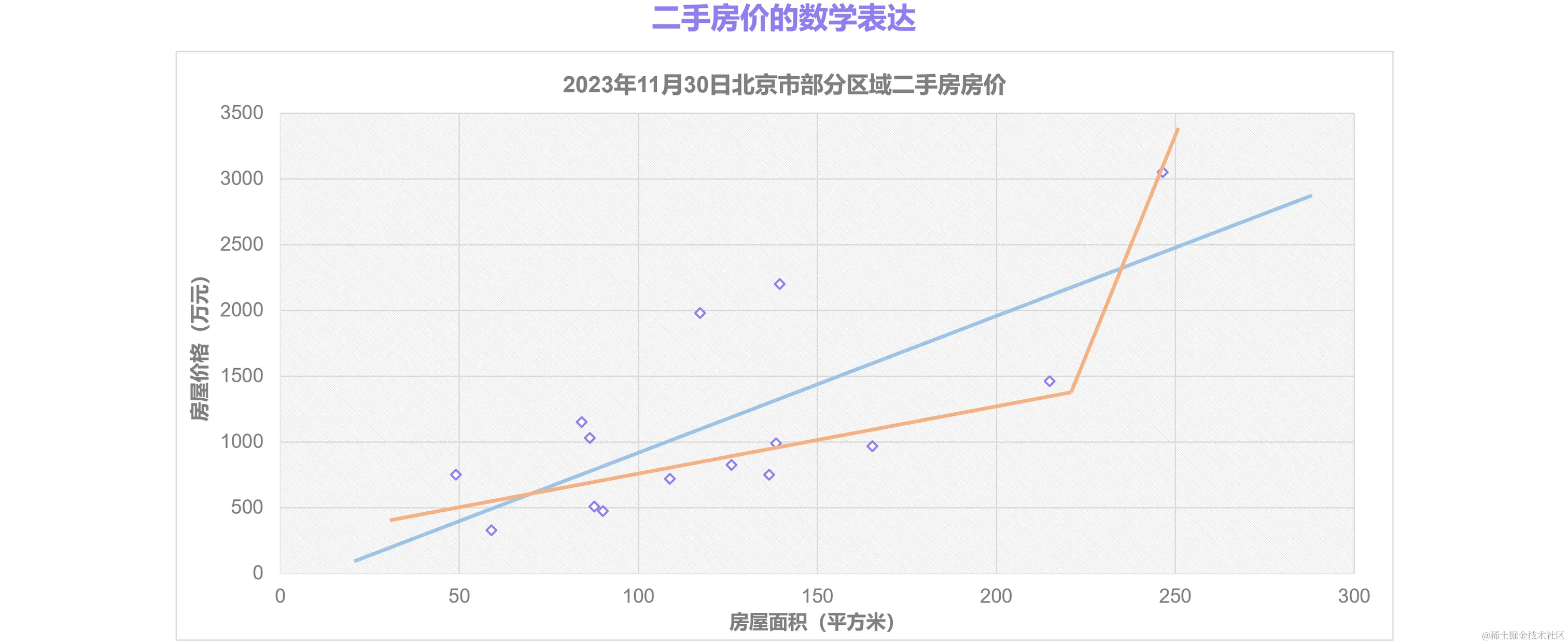 从上图中可以看到:蓝色和橙色函数均可以表达面积和房价的关系,但是哪一条是最合适的需要有充分的说服力。