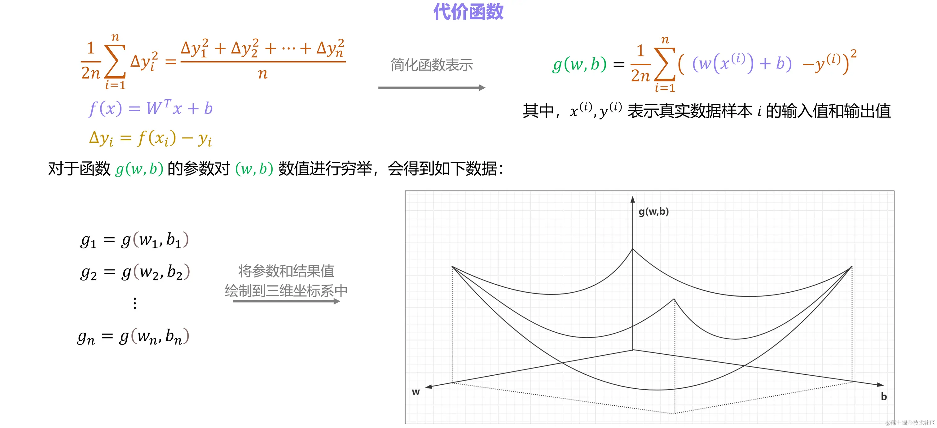 对于函数 g(w,b) 的参数对 (w,b) 数值进行穷举,会得到诸多 g 和 g(w, b)的数据对,将这些数据对绘制到三维坐标系中,可以表示为如下图: