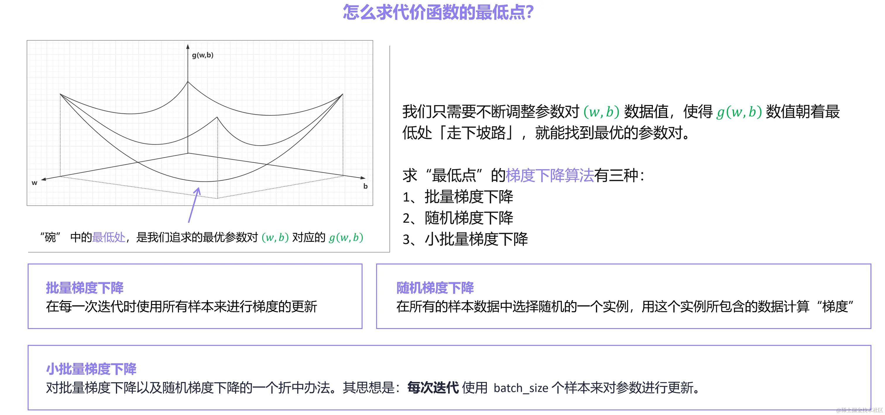 从上图可以看到,三维坐标系中的函数图像”最低处“就是方差最小的地方,也就是参数对(w, b)对于房价函数的最优解。求“最低点”的方法叫:梯度下降算法。