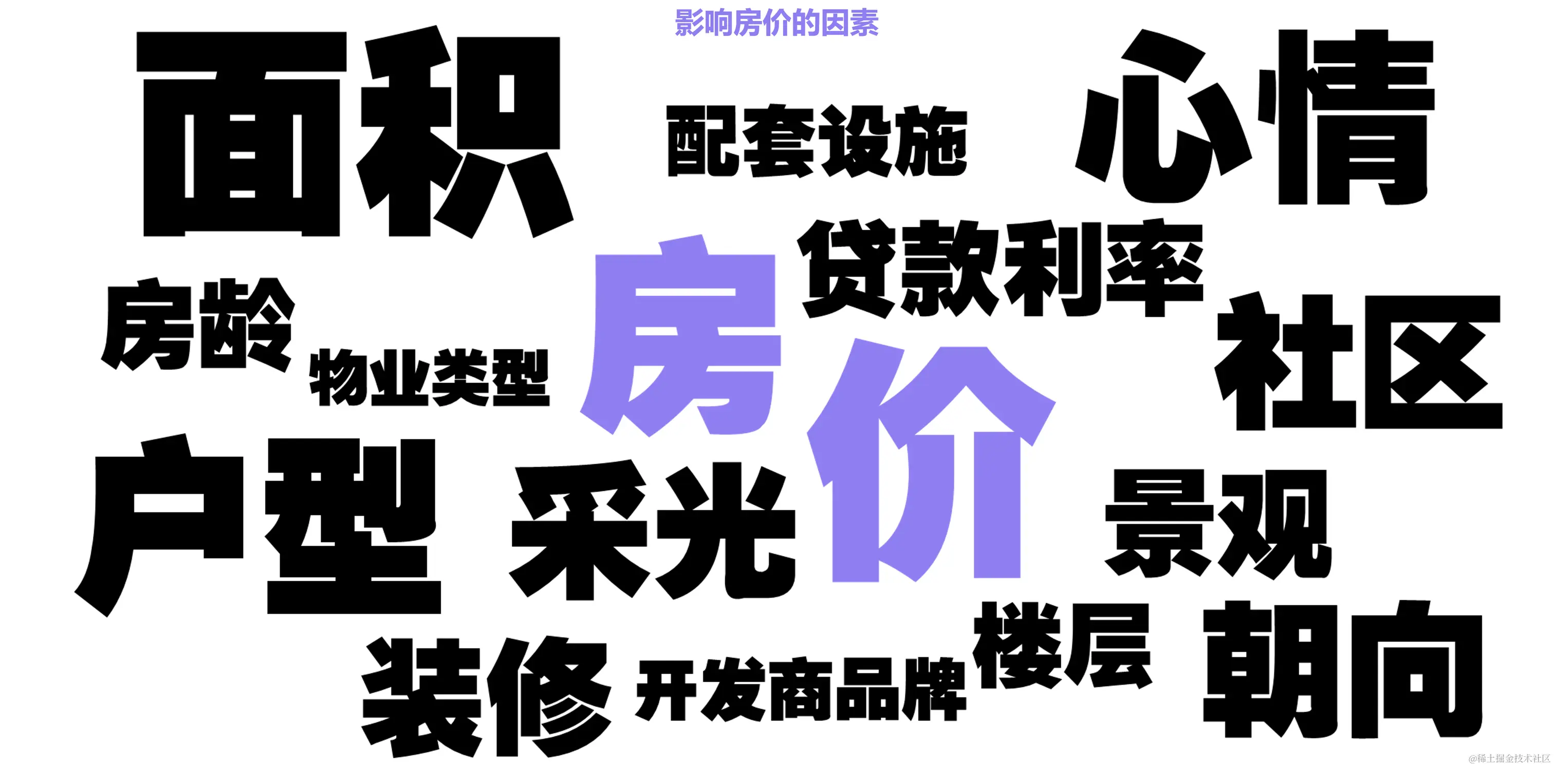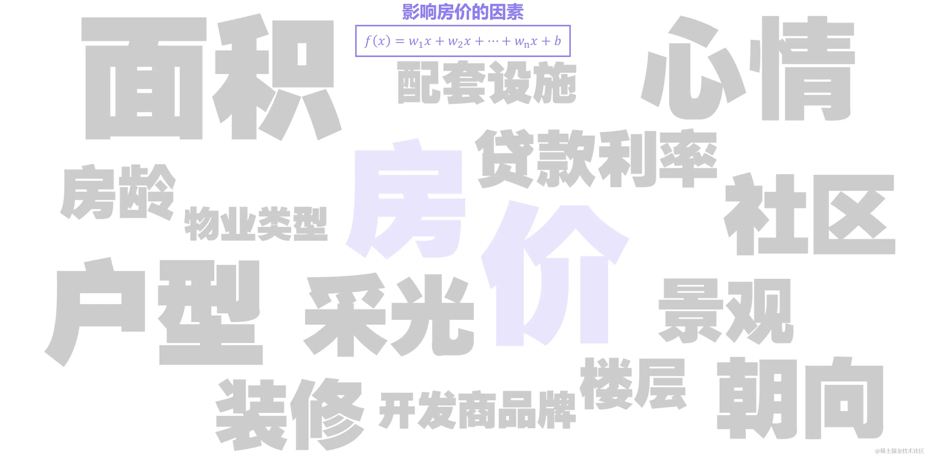 每一个影响因素可以使用形如面积和房价的函数关系式表达,所有因素之和最终决定了房价:
