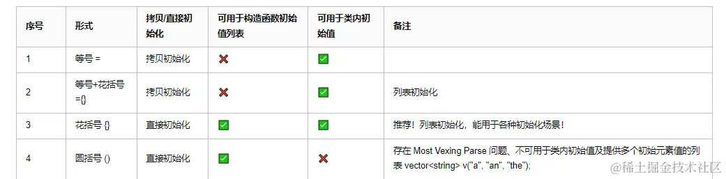 {}统一列表初始化,形式统一,能用于各种场景。 - 对于类成员的初始化,优先考虑类内初始值。如果需要根据传入构造函数的参数来初始化成员,可以使用构造函数初始值列表,不要在构造函数体内部对类成员进行赋值。