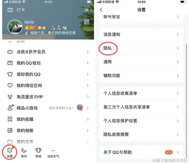 步骤1:qq通讯录怎么让别人看不到我?打开QQ,点击个人头像,进入**【设置】页面,接着选择【隐私】**选项。