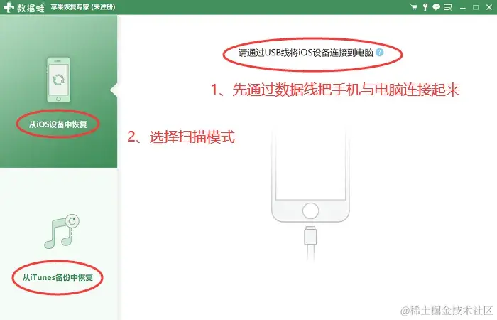 备注:如果你之前没有备份过手机数据,选择通过iOS设备恢复数据;如果你之前有通过iTunes备份数据,那么可以选择该模式。