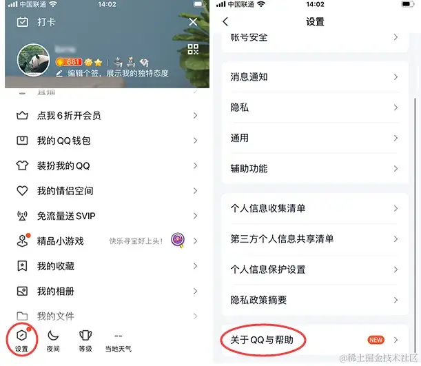 步骤1:在手机上打开QQ并进入界面后,点击左上角的个人头像。在**【设置】界面点击【关于QQ与帮助】**选项。