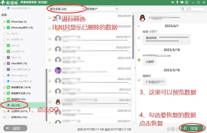 步骤2:数据扫描完成,界面左侧列表会显示苹果的所有数据,包括QQ聊天记录、微信记录、手机照片、备忘录等数据。点击**【QQ】类别,在界面上方进行筛选,只显示已经删除的聊天记录。对数据进行预览,无误后点击【恢复】**。