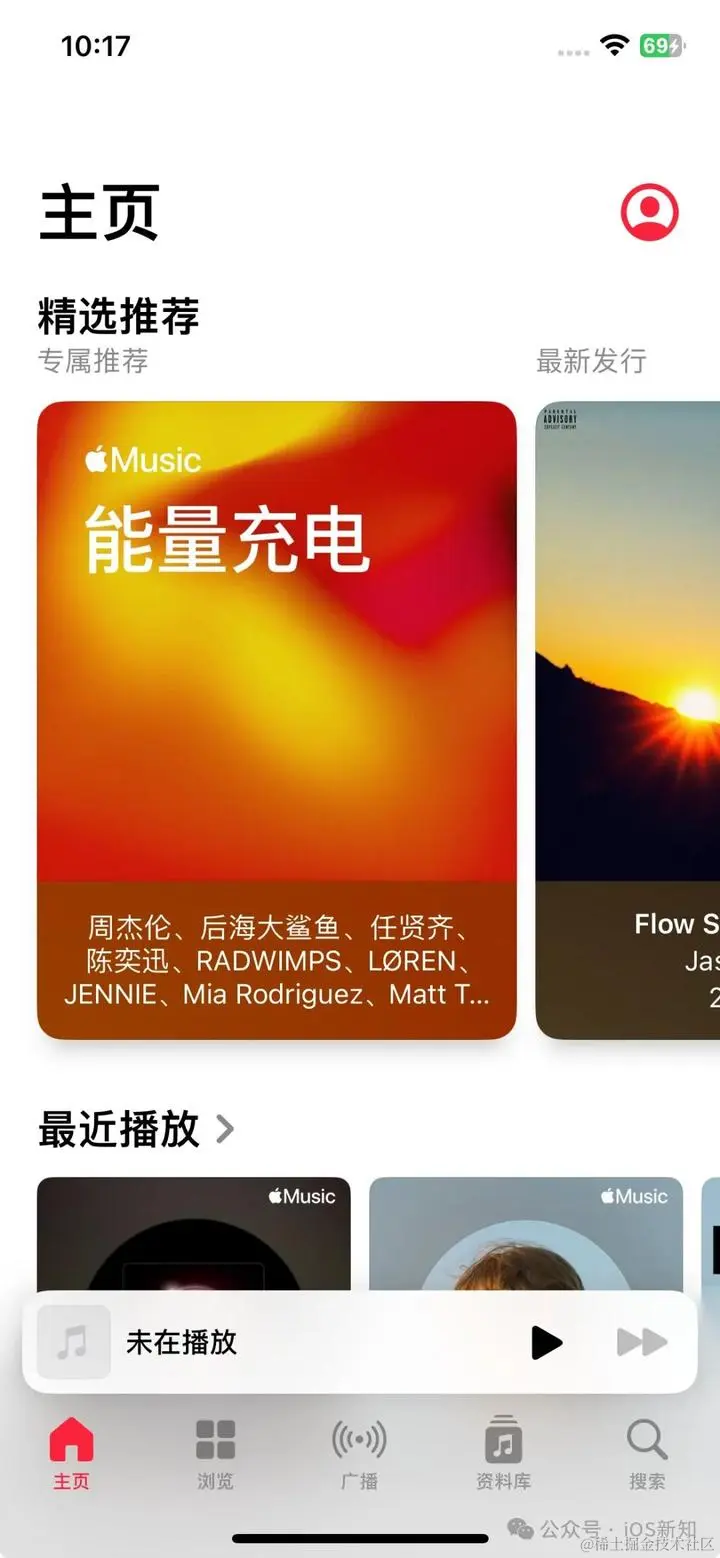 在苹果音乐 App 中,苹果已将首页底部第一个 Tab 选项卡“现在就听”改名为“首页”,并把图标换成了家园的图标。