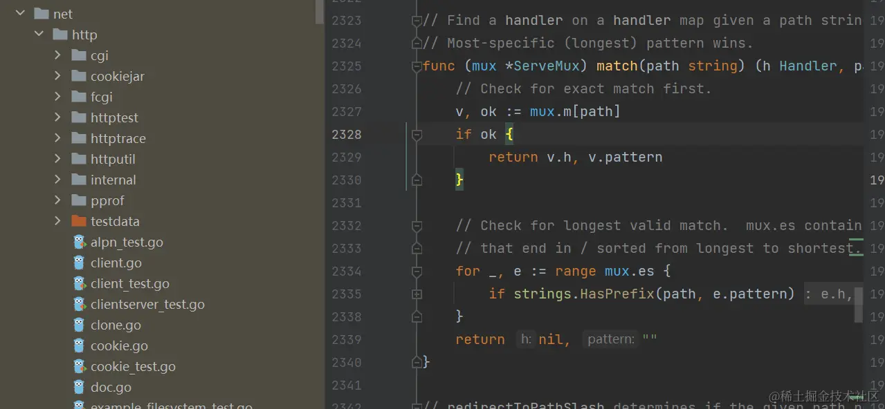 ServeMux.match()方法用于根据给定的具体路径 path 找到最佳匹配的路由,并返回Handler和路径。