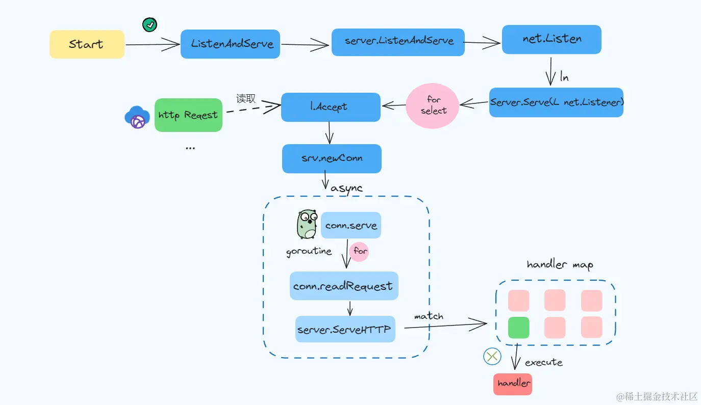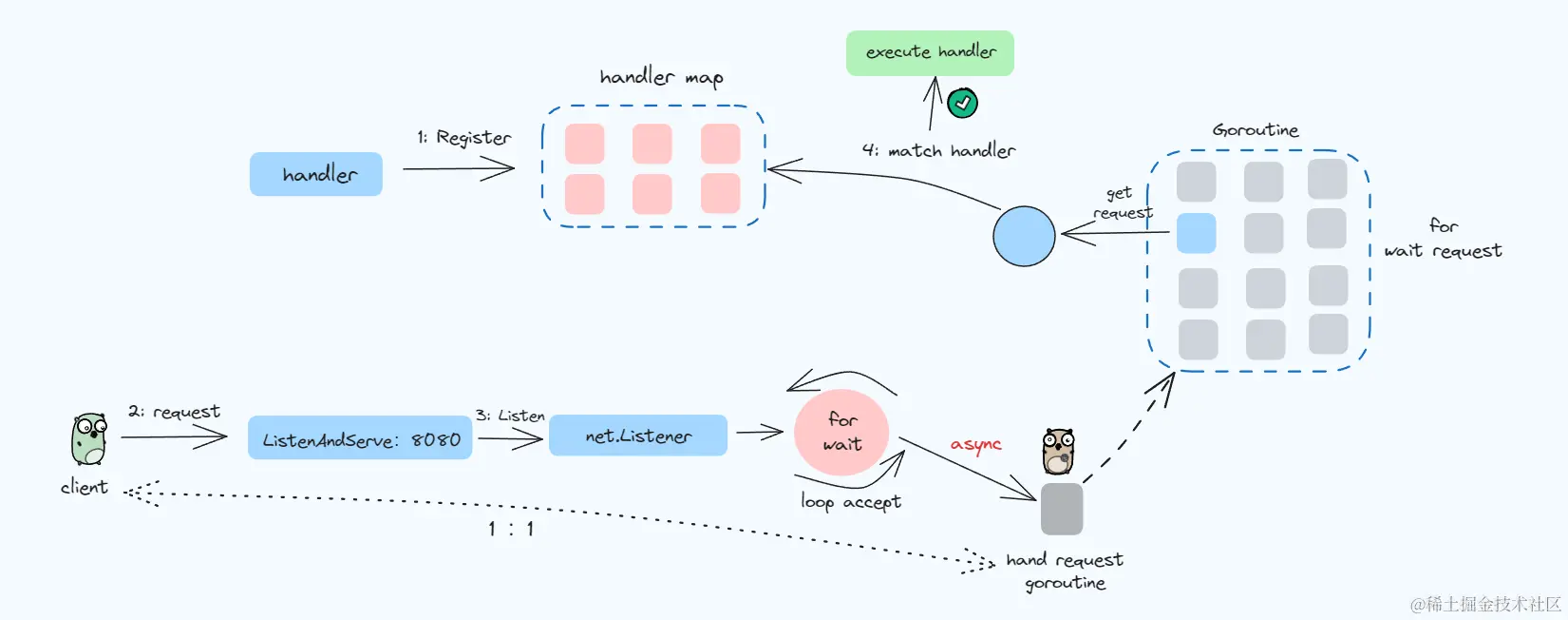 - handler注册完之后就开启循环监听,监听到一个连接就会异步创建一个 Goroutine