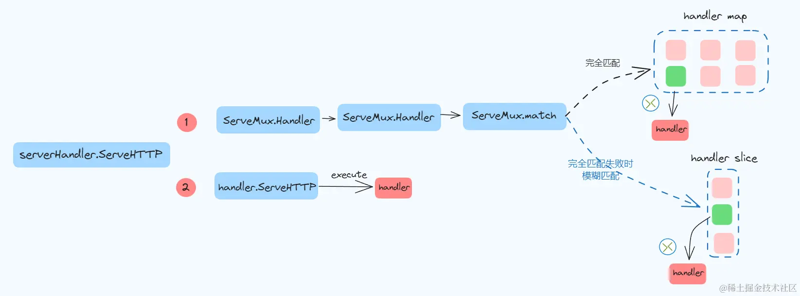 - 通过 ServerMux.Handler() 方法获取到匹配的处理函数 h