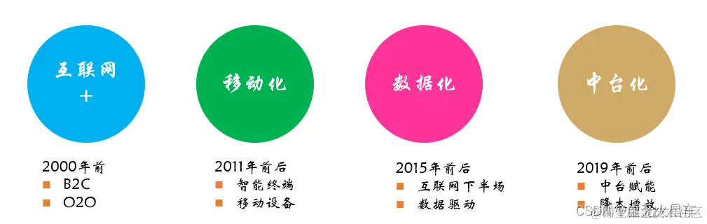 - 中台时代:2019年被很多人称之为中台元年,中台之所以被当作数字化转型的救命稻草,本质是因为中台的复用能力,数据快速服务化输出的能力,可以更快的实现数据赋能。