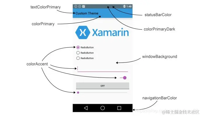 某些 Views “normal” 状态下的颜色,常见如:unselected CheckBox 和 RadioButton,失去焦点时的 EditText,Toolbar 溢出按钮颜色,等等。
