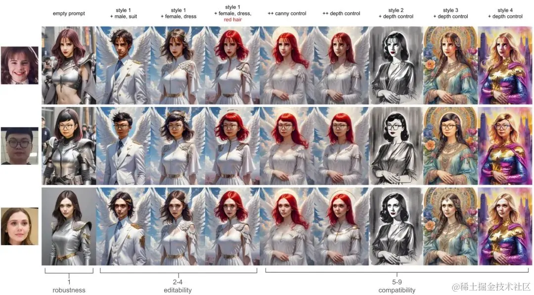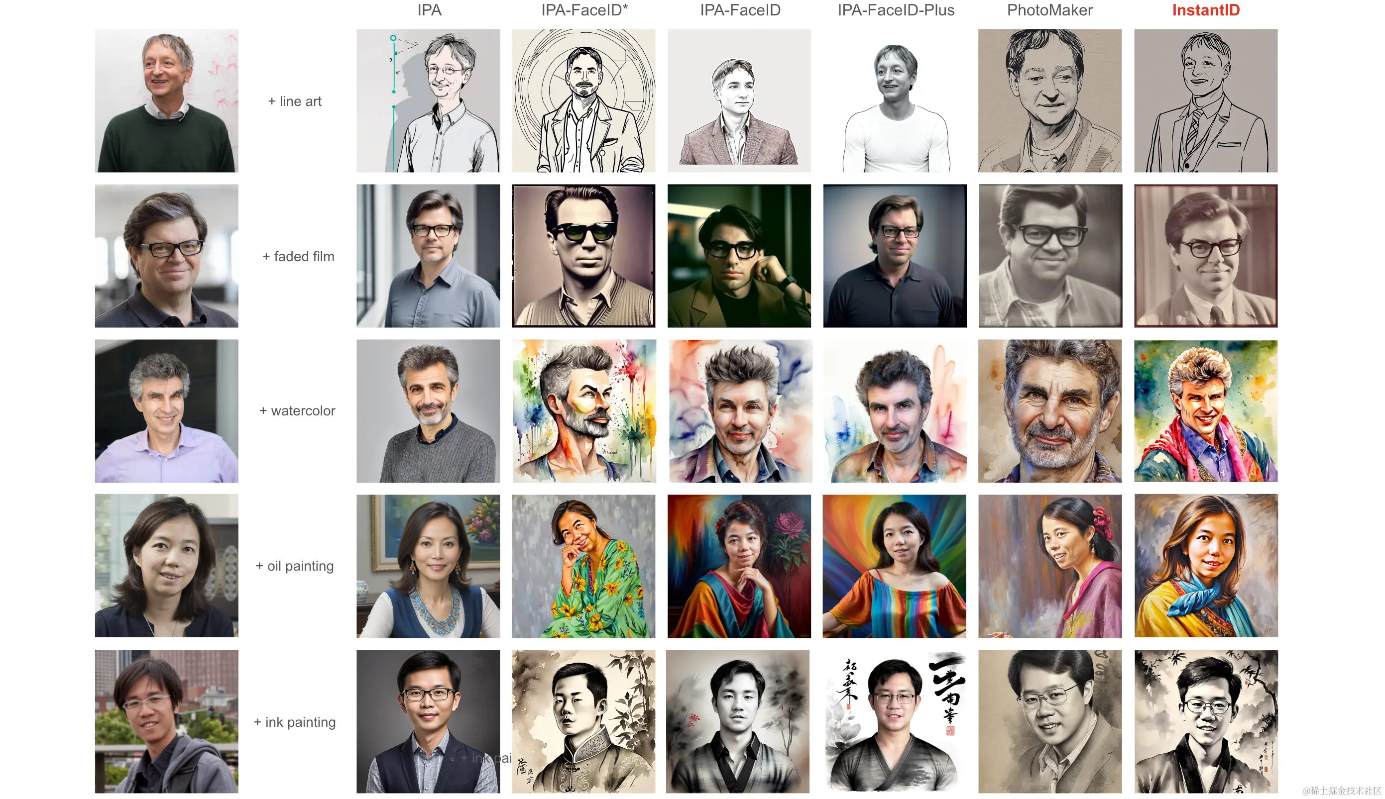 InstantID在多个方面超越了现有技术。与PhotoMaker等相比,InstantID在保真度和文本可编辑性上表现更佳。它的特点是不需要任何训练即可达到与LoRA等技术竞争的效果。此外,与InsightFace Swapper相比,InstantID在非写实风格的图像生成中显示出更好的灵活性和融合能力。