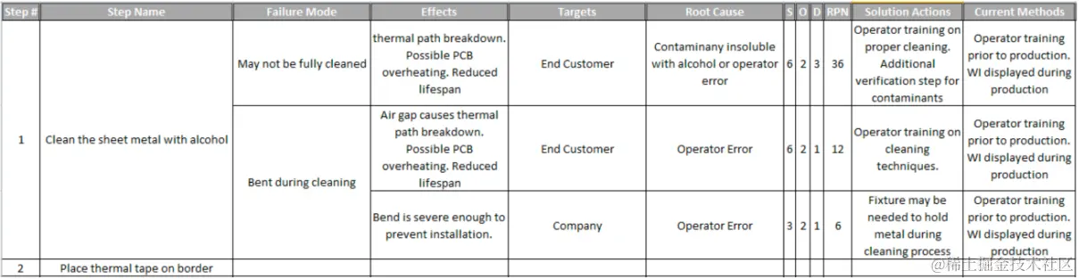 下面是一个源自《Using FMEA to Improve Software Reliability》(链接放在文稿末尾,感兴趣可自行阅读)的例子,例子本身要做的事情是使用导热胶带将 PCB 板附着到金属散热片。对于这个生产流程来说我们应该不用过多了解,只需要通过这个例子熟悉下 FMEA 的步骤。