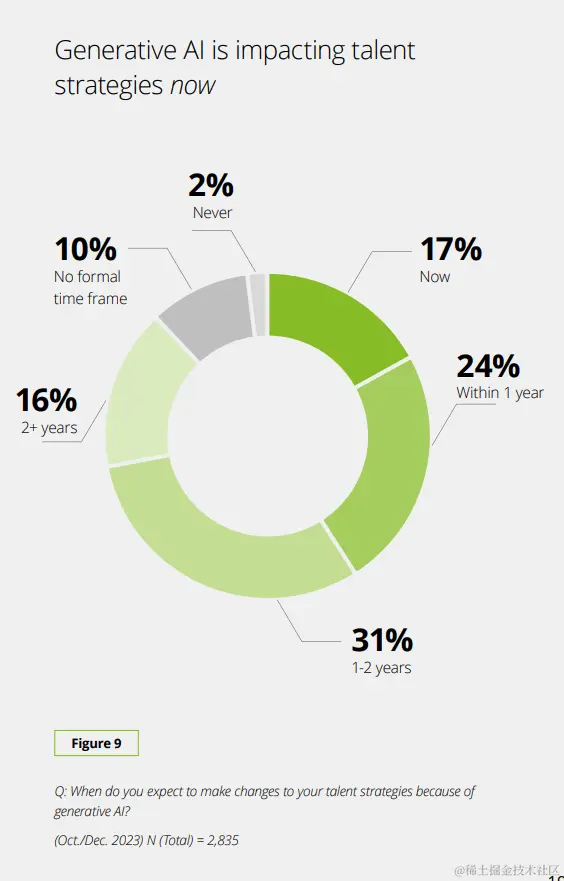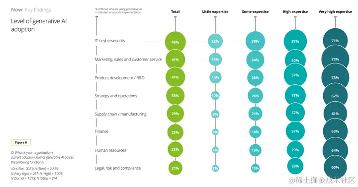 受访者认为,应用生成式AI的最大壁垒是缺乏技术人才和技能。仅22%的受访者认为自身企业有准备应对生成式AI相关的人才问题。仅47%的企业表示为员工提供了充足的培训,以帮助他们了解生成式AI的能力、效益和价值。