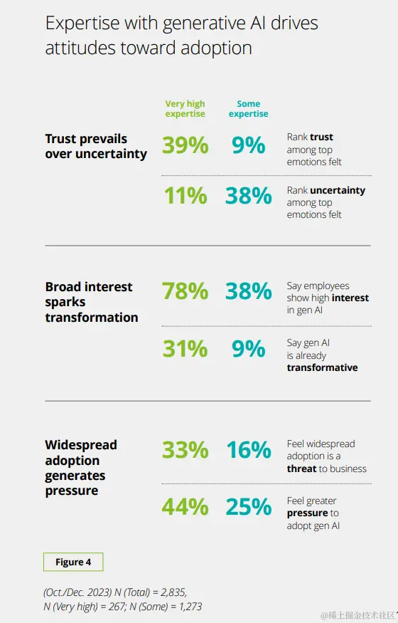 这些企业对生成式AI技术的信任度高于不确定性,他们更有信心应对生成式AI带来的变革,但也看到了更大的隐患。大部分人认为GAI技术的广泛应用对他们企业运营和业务带来威胁,比如缺乏技术人才和技能,风险准备工作还不充足等,这也加大了企业采用生成式人工智能并扩大规模的压力。