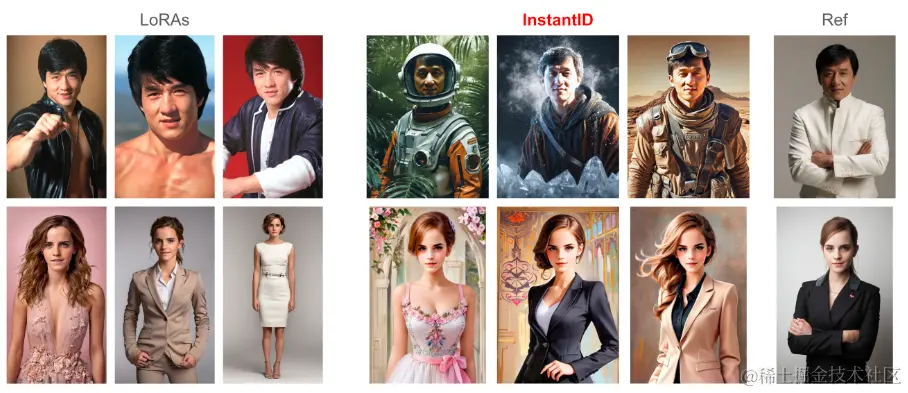 - 与现有的基于ID嵌入的方法(如IP-Adapter)和LoRA模型相比,InstantID在保持身份的同时,展示了更高的保真度和风格灵活性。