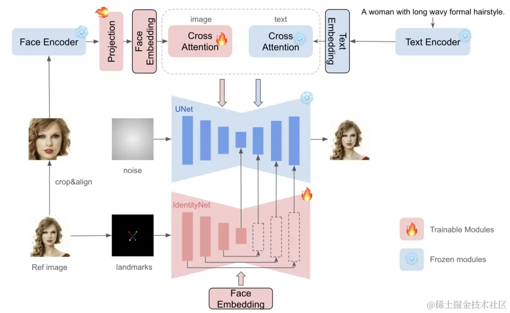 - 在训练过程中,只有Image Adapter和IdentityNet的参数会被更新,而预训练的文本到图像模型的参数保持不变。