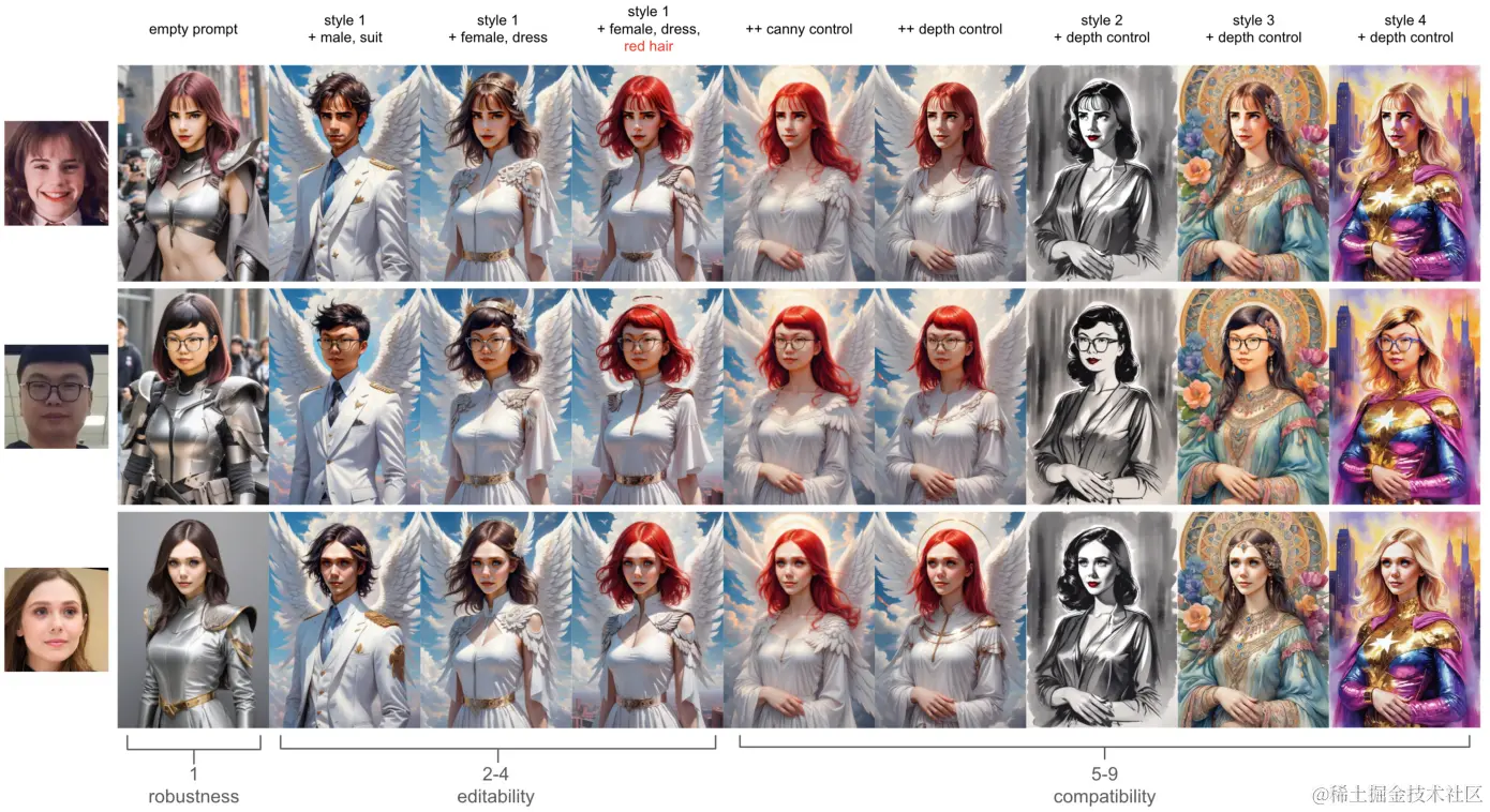 - InstantID在保持文本编辑能力的同时,能够实现性别、服装和发色等属性的编辑。