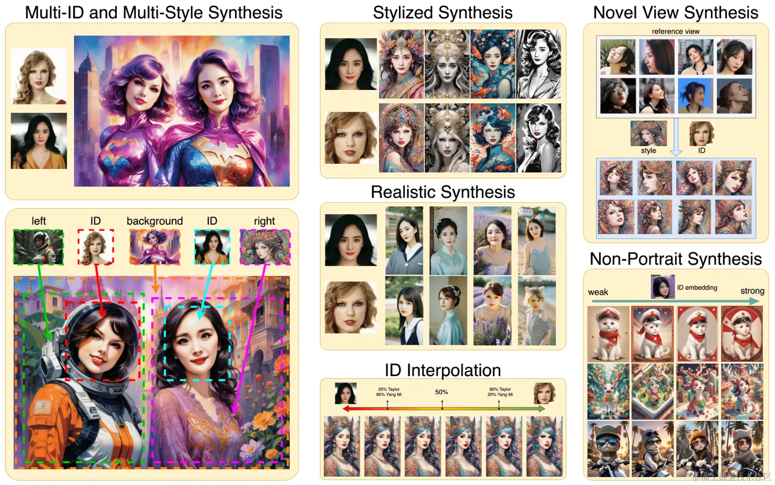 - InstantID的低成本和即插即用特性为多种下游应用打开了大门,如新视角合成、身份插值和多身份合成。