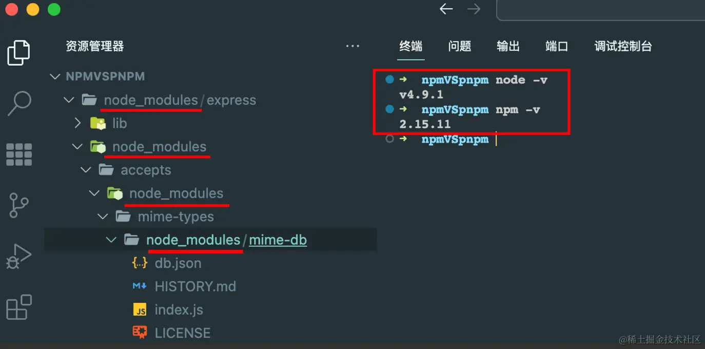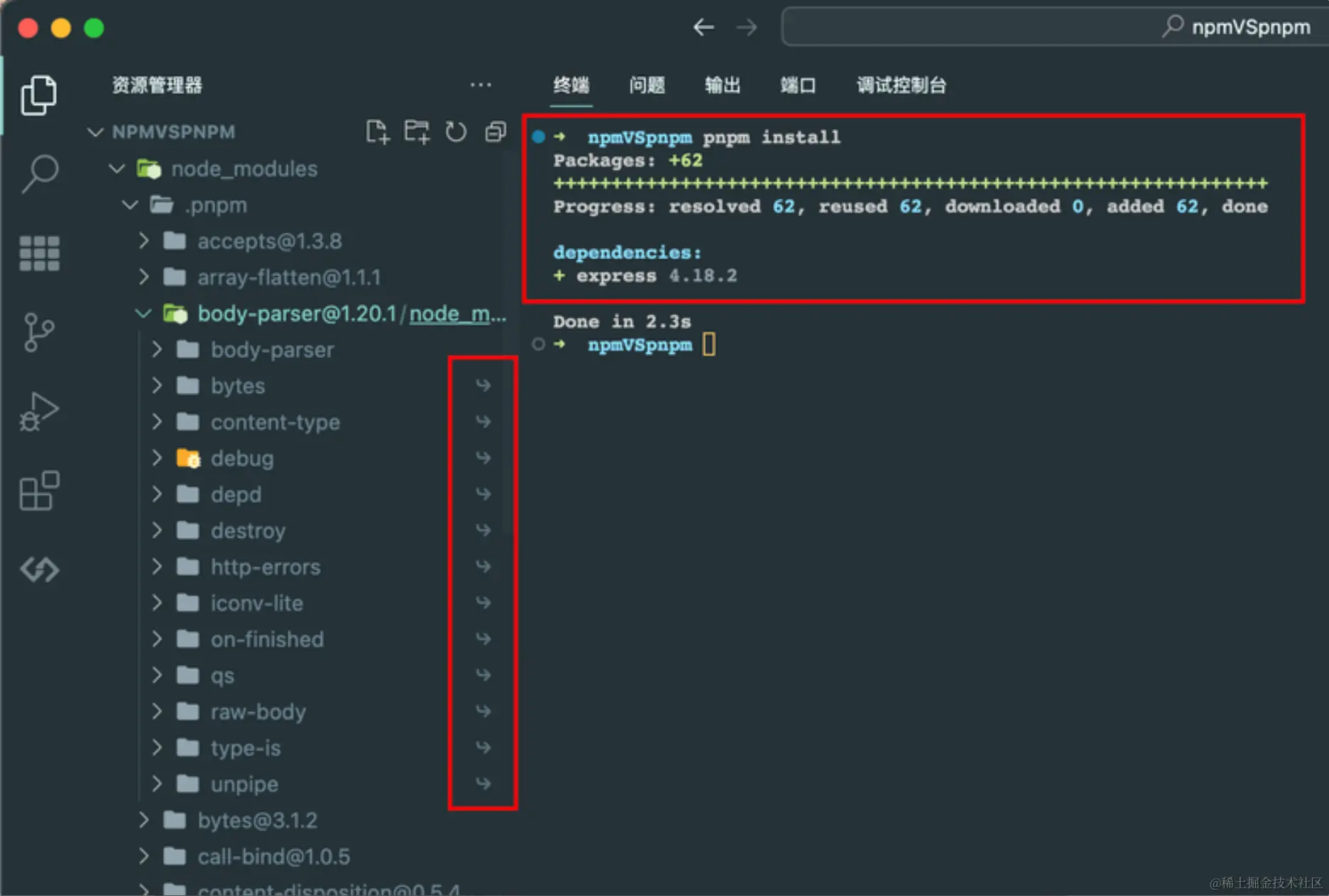 - 打开 node_modules 可以看到,确实不是扁平化的了,依赖了 express,那 node_modules 下就只有 express,没有幽灵依赖