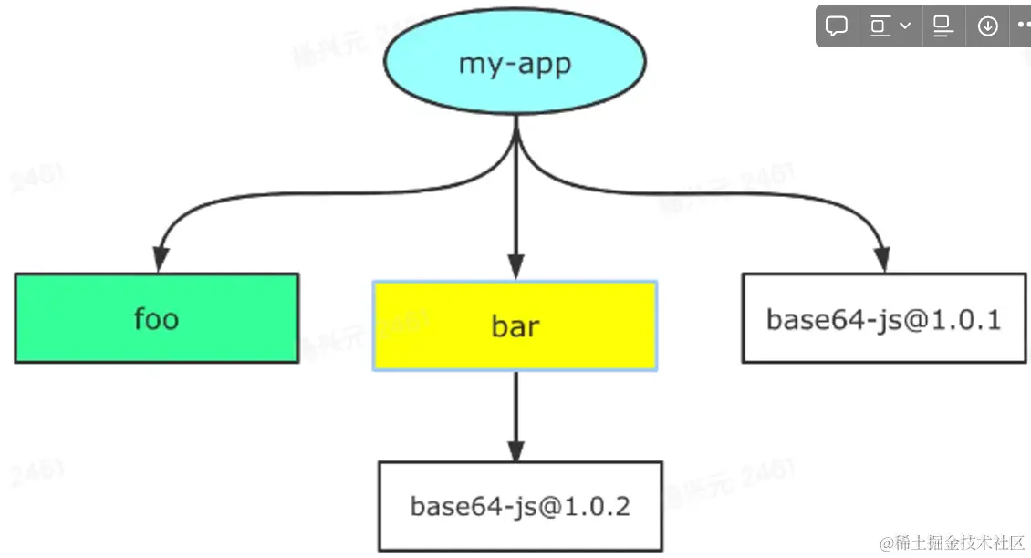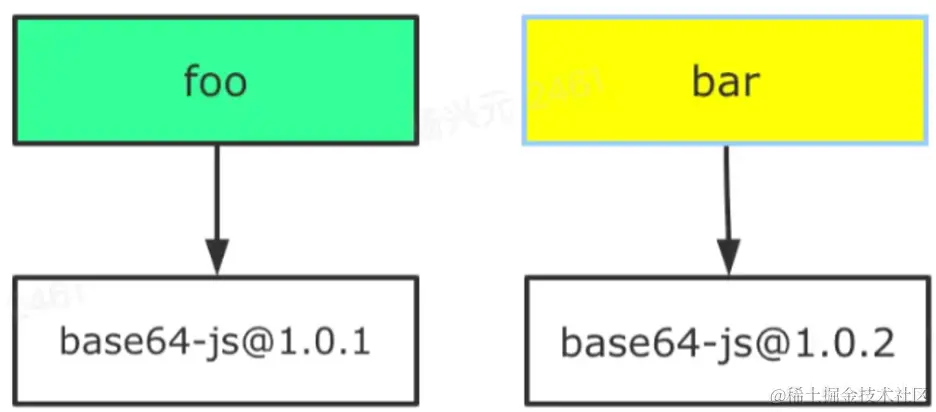 - 假如现在项目依赖两个包 foo 和 bar,这两个包的依赖又是这样的: