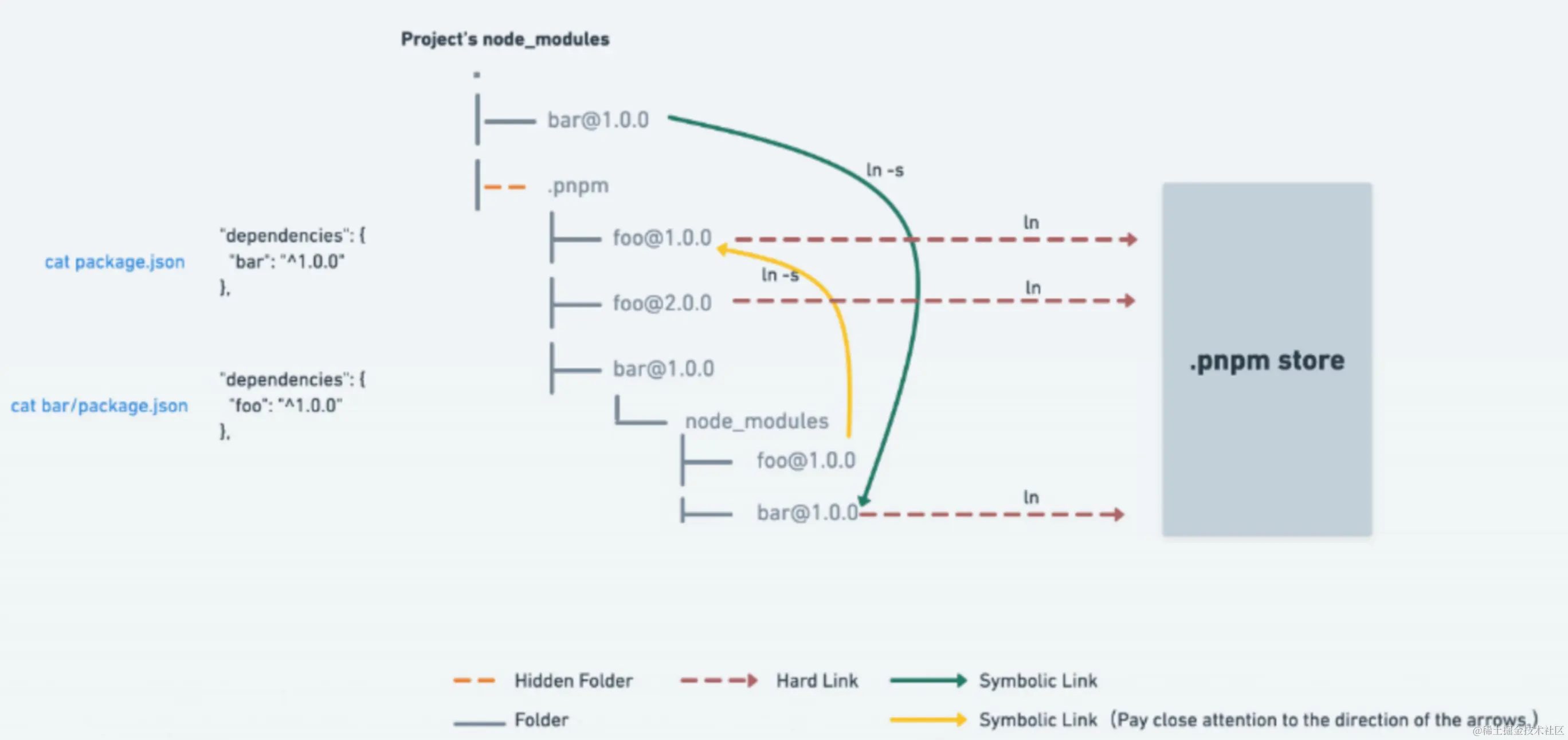 - .pnpm是个一个虚拟store(Virtual store),里面的依赖包 硬链接 到真实Store(Content-addressable store)中,真实Store才是依赖包文件真正的存储位置
