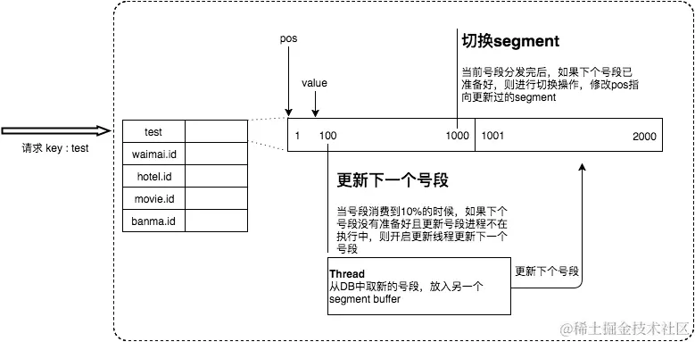Leaf 对原有的号段模式进行改进,比如它这里增加了双号段避免获取 DB 在获取号段的时候阻塞请求获取 ID 的线程。简单来说,就是我一个号段还没用完之前,我自己就主动提前去获取下一个号段(图片来自于美团官方文章:《Leaf——美团点评分布式 ID 生成系统》)。