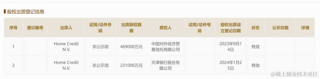 继股权质押给中国外贸信托后,捷信消金的母公司捷信集团(Home Credit N.V.)再次将捷信消金剩余股权悉数质押给天津银行。