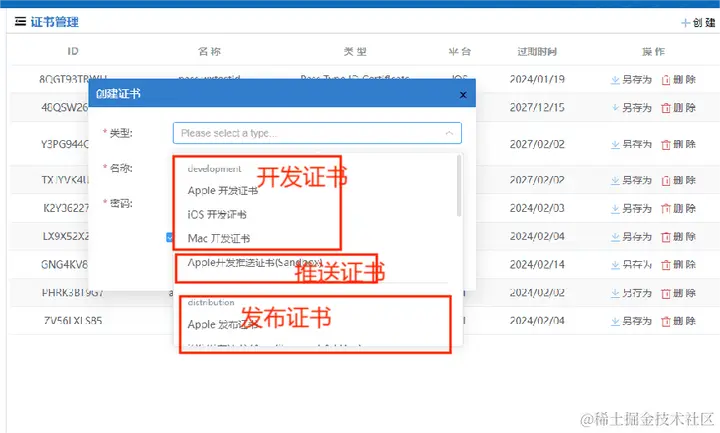 2.进入证书管理页面,在其中创建证书。名称和密码可以随意填写,但密码需要记住,因为它对应HBuilder打包