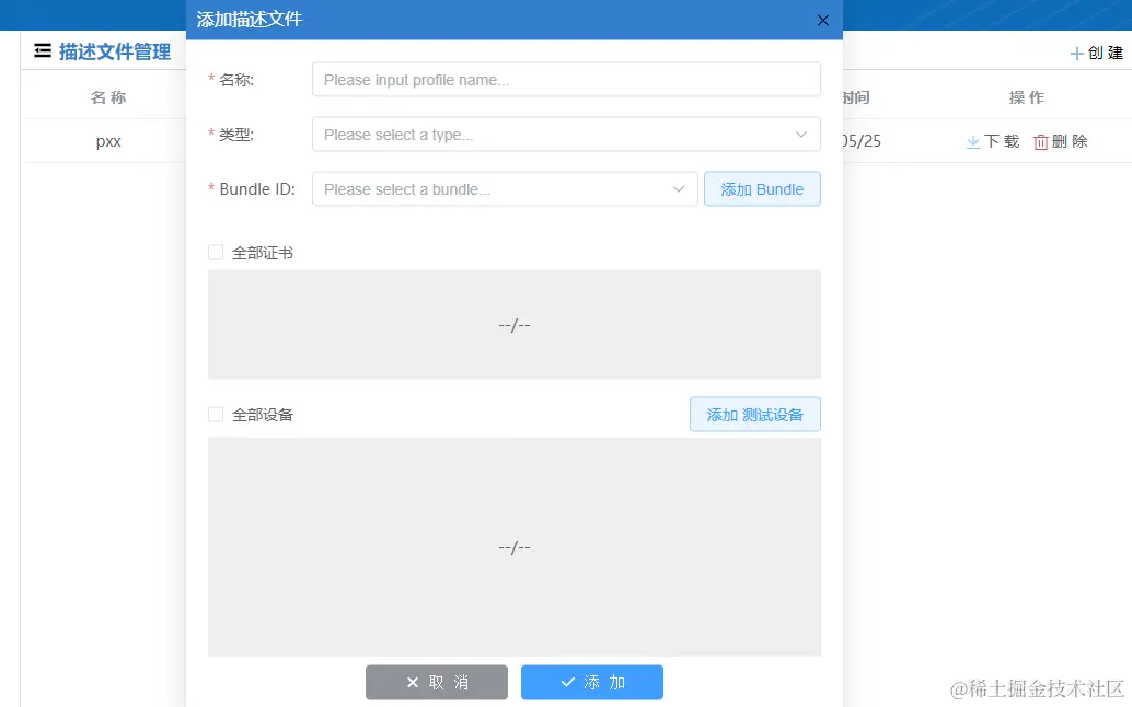 1.进入描述文件管理页面,添加描述文件。可以随意设置名称,选择对应的类型,并勾选相应的证书和设备。