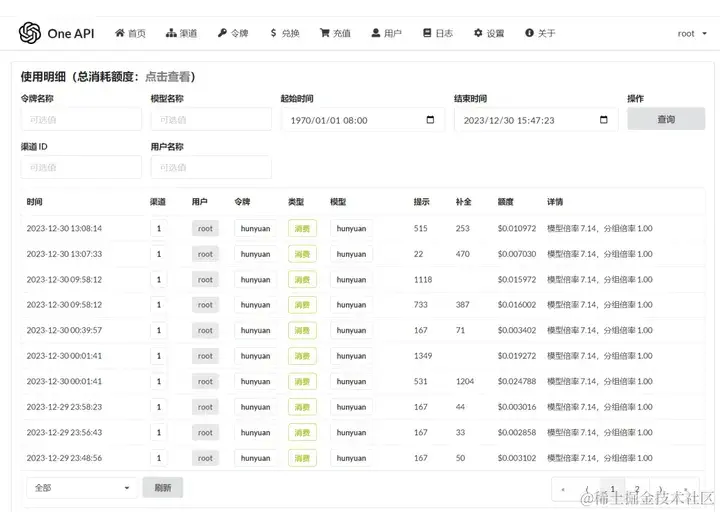 日志展示用户充值和额度消耗记录,普通用户与管理员用户查看的范围不一样,普通用户只能看到自己的。