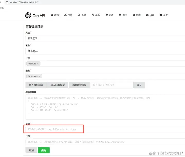 密钥:从大模型厂商获得的 API Key,每家厂商的填写格式可能都不一样,选完类型以后会有提示,按照提示填写,填写密钥为腾讯云的密钥管理— API 密钥管理里获取 APPID、SecretId 和 Secretkey