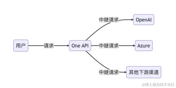 以上我们便已经安装并配置好了 One API 系统,那么如何给终端使用呢?其实很简单,使用客户端或编程的方式调用 One API 的 API 接口就行了,使用方式与OpenAI API 一致。相当于只需要将 OpenAI 的网址改成你部署的 One API 系统的网址、将 OpenAI 的 API Key 改成你的令牌即可。One API 将代理用户向实际的大模型发出请求并接收响应,如下图所示: