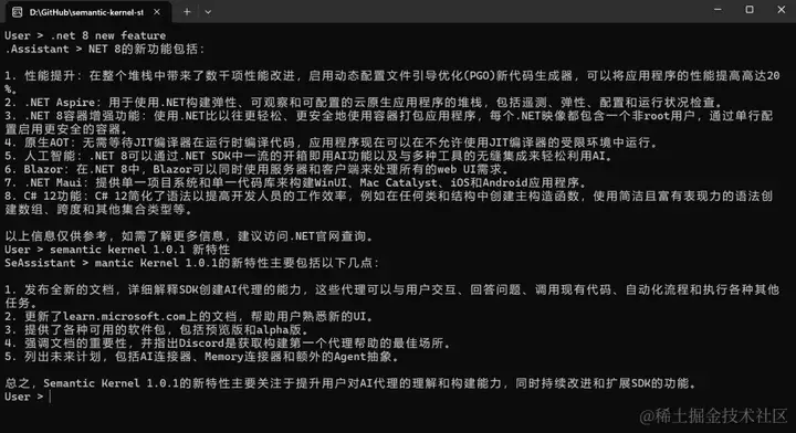 接下来开启一个聊天循环,使用 SK 的流式传输 InvokeStreamingAsync,如第 42 行到 46 行代码所示,运行起来就可以体验下列的效果: