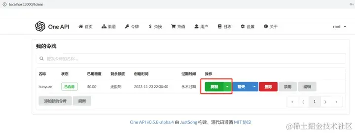 接着,我们创建令牌,供客户端或调用方使用,其作用跟大模型厂商的令牌或密钥的概念和作用是一样的。点击令牌,然后点击添加新的令牌,如图添加即可,过期时间可以选择永不过期。