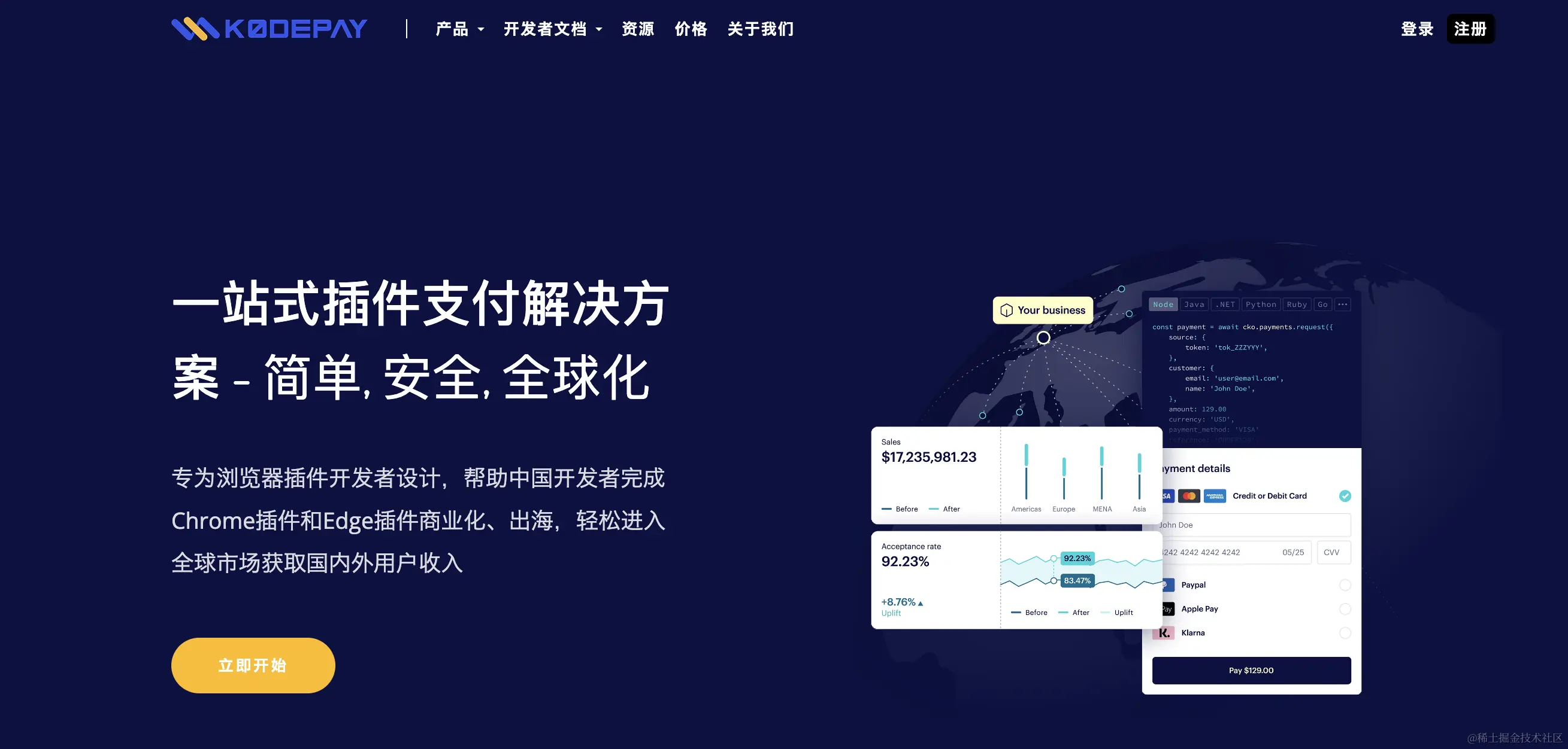KodePay是专门为中小开发者而准备的一个支付服务,同样是根据交易流水收取手续费没有其他费用。其特别针对浏览器插件和简单的网页端支付做了集成封装,开发者可以一天内完成单次付款、订阅等支付功能接入。其优势在于国内开发者也可以正常接入,使用信用卡全球收款、ApplePay等服务。