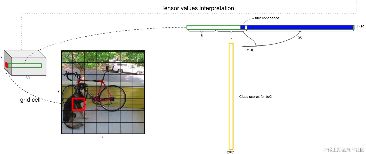 如上图,输出为。为个网格。对于每一个网格,对应30个数字,这30个数字是由5+5+20构成。两个5分别为:第一个和第二个预测框的四个位置坐标和一个置信度构成。20:是网格对20个类别的类别概率。