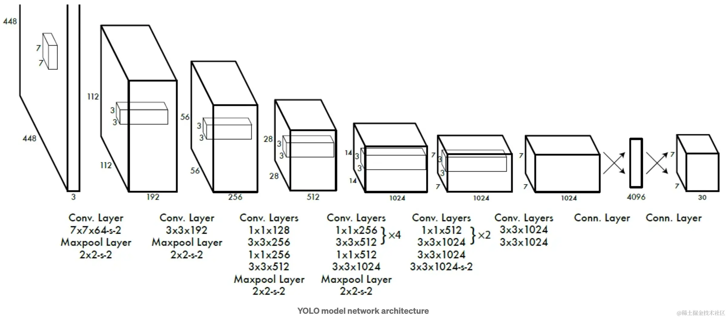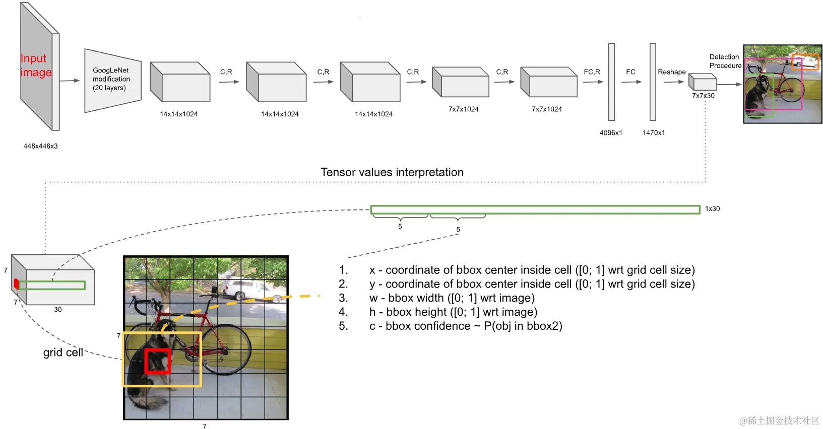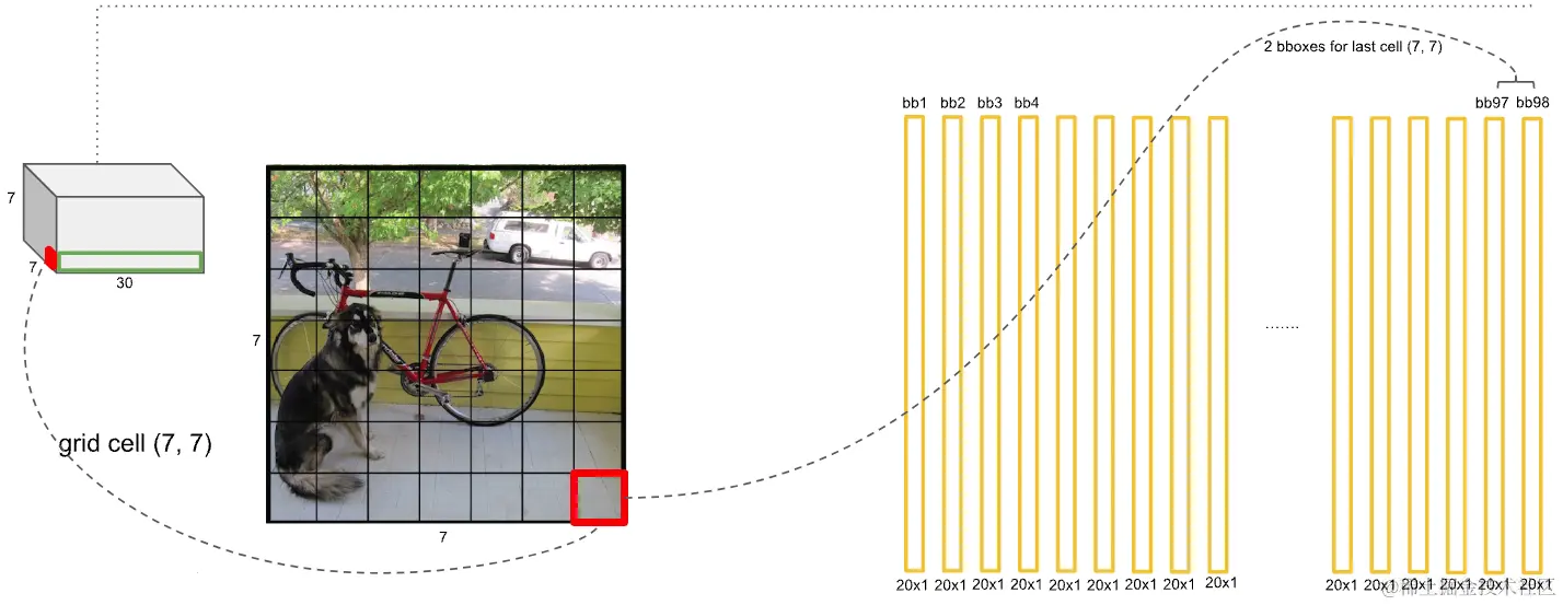 包含两个预测框,每个预测框有5个参数(x,y,w,h,c)。两个框便是10个参数。在pascal voc中包含20个类别,那么5+5+20,那么就是30,这个30维的向量就是一个网格的信息,共有个网格,所以输出是。