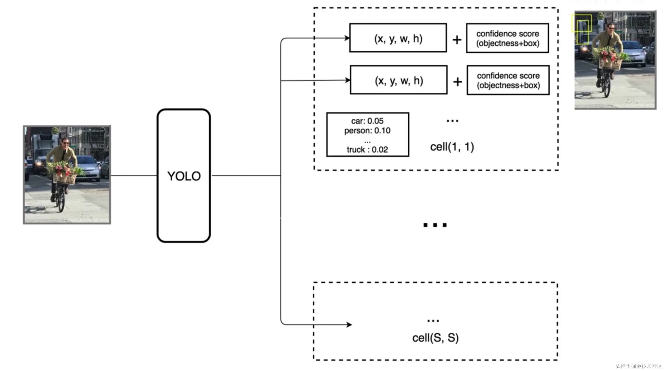 结合预测框的信息和网格类别信息,就可以获得最后的预测结果。这些信息都是从的张量中获取的。