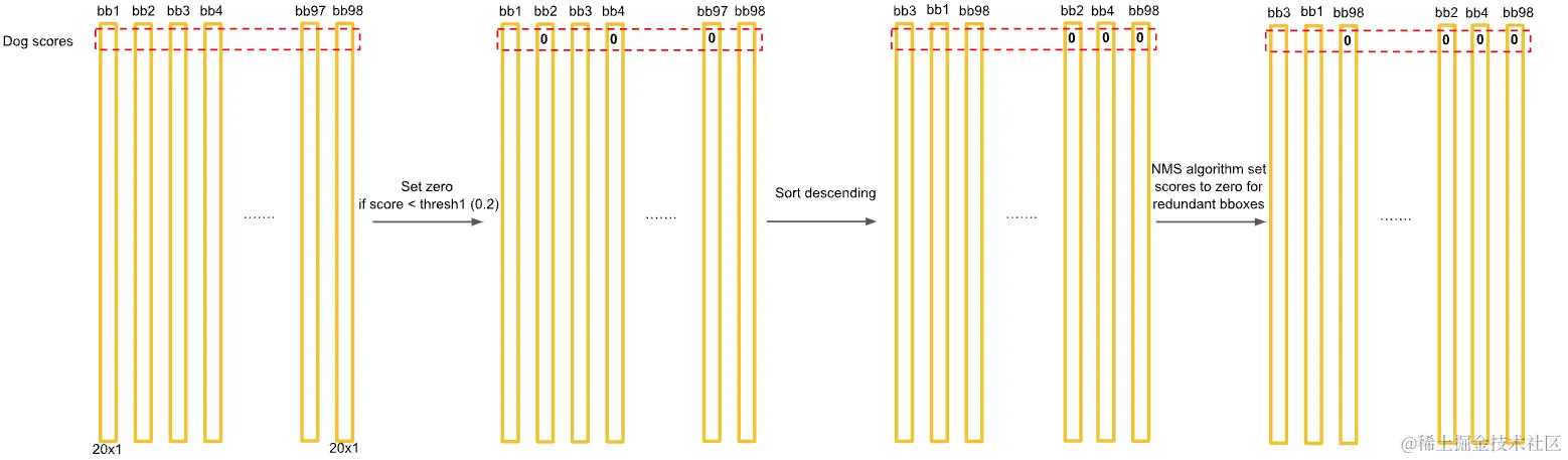我们先只看狗这一个类别,假如狗是这20个类别中的第一个类别。我们设置一个阀值,假设,那么我们将这98个向量中狗的概率小于0.2的值全部设置为0。我们再按照狗的概率的大小进行排序,将概率大的放置在前面,将概率小的放置在后面。再对排序后的值进行非极大值抑制操作(NMS)。